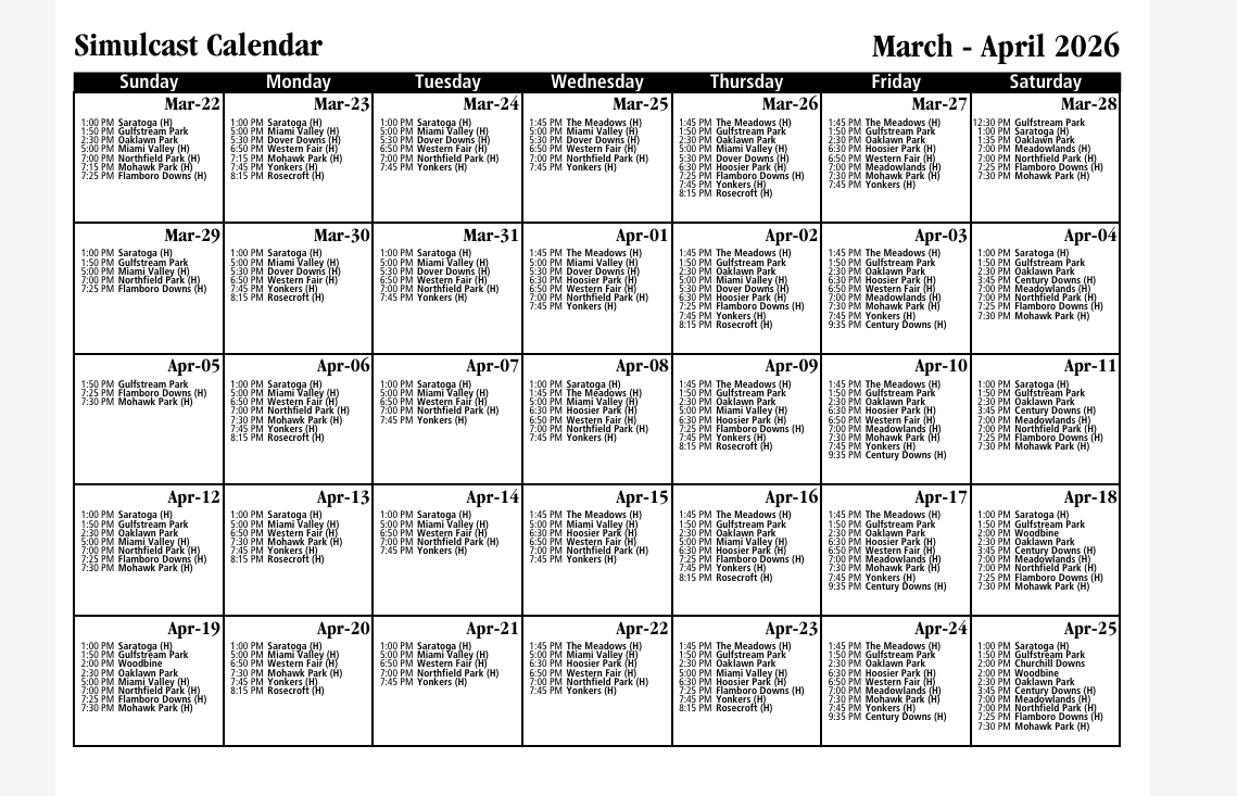 Welcome to the Winner's Circle – OTB schedule page. Whether you're a seasoned bettor or new to the thrill of off-track wagering, find all the upcoming event dates and details right here. Join us for exciting racing action!